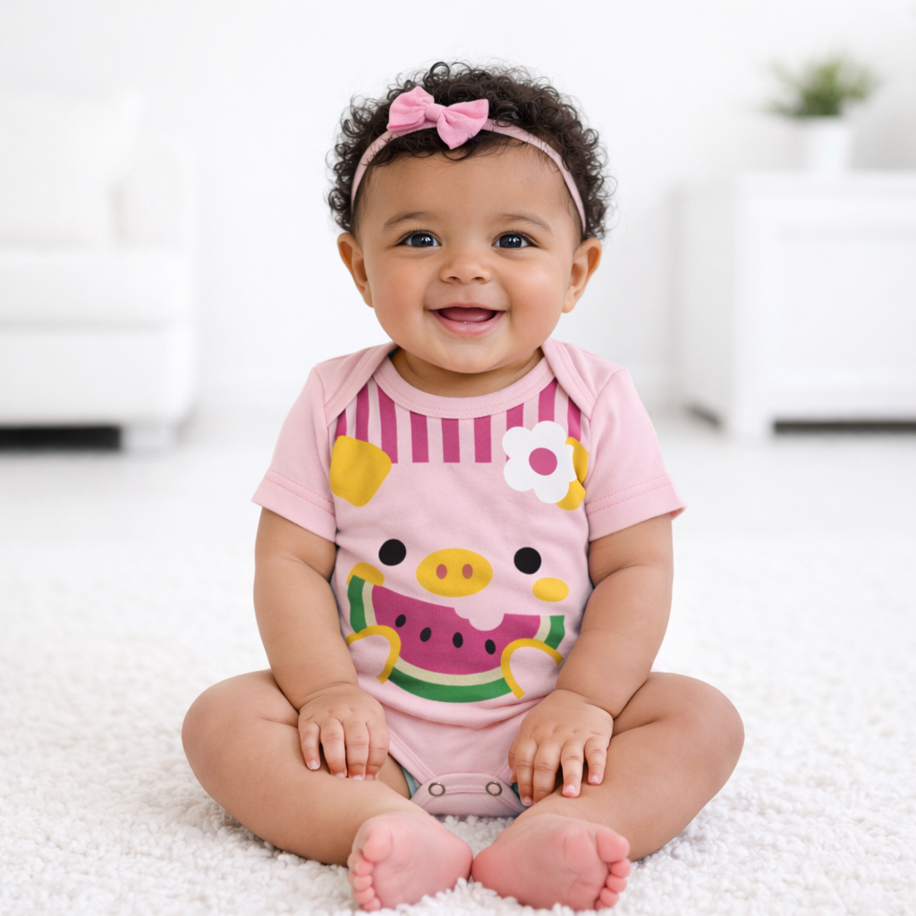 O modelo conta com mangas curtas, sendo perfeito para os dias mais quentes ou para compor looks com sobreposições. O decote transpassado no pescoço facilita a passagem da cabeça do bebê, tornando o momento de vestir muito mais prático e confortável, sem apertar ou incomodar.